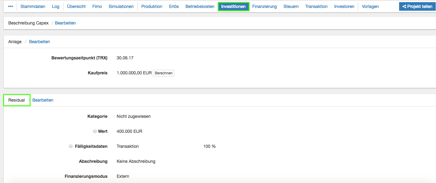 Das Residual wird durch alle Investitionen die im Kaufpreis enthalten sind reduziert. Hat der Projektentwickler Investitionen wie z.B. Zusatzinvestitionen, die er nicht in den Kaufpreis mit einbeziehen möchte, kann man beim Erfassen einer neuen Investitionsposition das Inputfenster "Im Anlagekaufpreis inbegriffen" deaktivieren. Dazu finden Sie mehr im Artikel "Was bedeutet im Anlagekaufpreis inbegriffen".