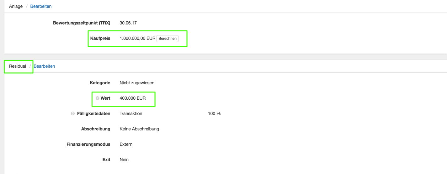 In unserem Beispiel haben wir einen Kaufpreis von 1'000'000 EUR und Investitionskosten in Höhe von 600'000 EUR. Das Residual ist demnach 400'000 EUR.