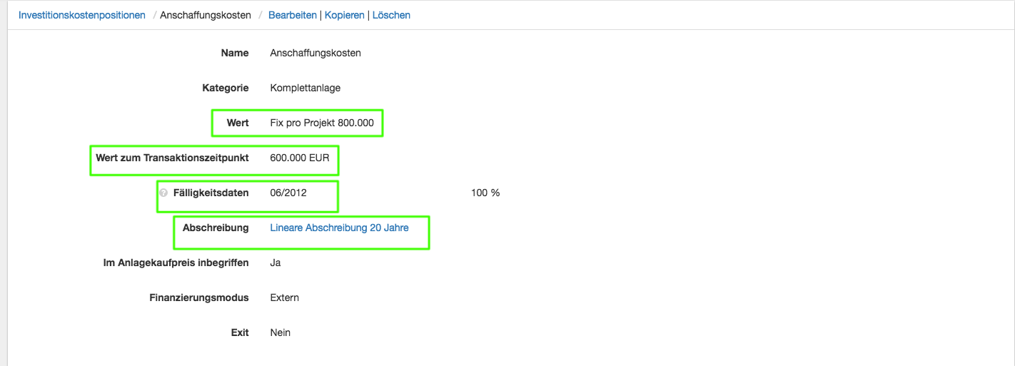 Hinweis: Liegt das Fälligkeitsdatum einer Investitionskostenposition vor dem Transaktionszeitpunkt und wurde diese bereits zu einem Teil abgeschrieben, fliesst der Buchwert zum Transaktionszeitpunkt in die Berechnung ein (nicht der Anschaffungswert).