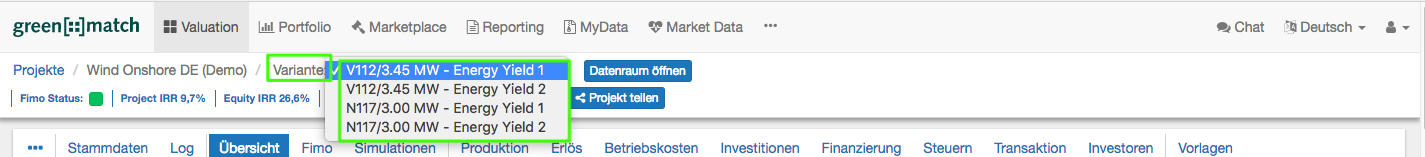 Hinweis: Die aktuell gewählte Variante ist in der Projektnavigation zu sehen. Mittels Dropdown kann auf andere Varianten umgestellt werden.