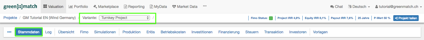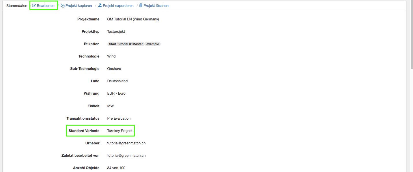 - Klicken Sie im Inputfenster "Stammdaten" auf "Bearbeiten". Hinweis: Im Beispiel lautet die aktuelle Standard Variante "Turnkey Project"