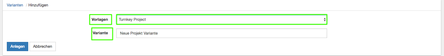 3.Haben Sie bereits mehrere Varianten erfasst, können Sie im Inputfeld "Vorlagen" wählen, welche Variante als Grundlage für die Neue dienen soll. Haben Sie noch keine zusätzliche Variante erstellt, gilt hier standardmässig die bereits erfasste "Erstversion". Zusätzlich können Sie der neuen Variante einen Namen geben. Um die neue Version anzulegen, klicken Sie auf "Anlegen". Nach dem Anlegen befinden Sie sich direkt in der neu erstellten Variante.