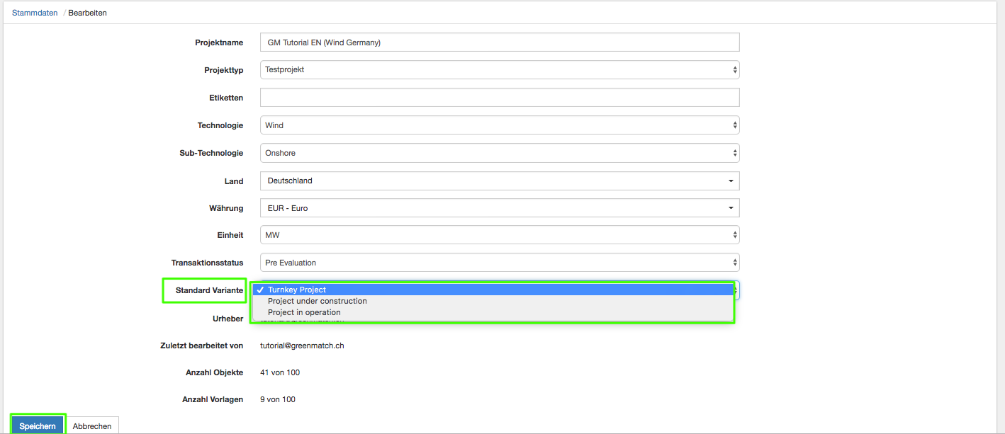 1. Klicken Sie im Inputfenster "Stammdaten" auf "Bearbeiten". Hinweis: Im Beispiel lautet die aktuelle Standard Variante "Turnkey Project"