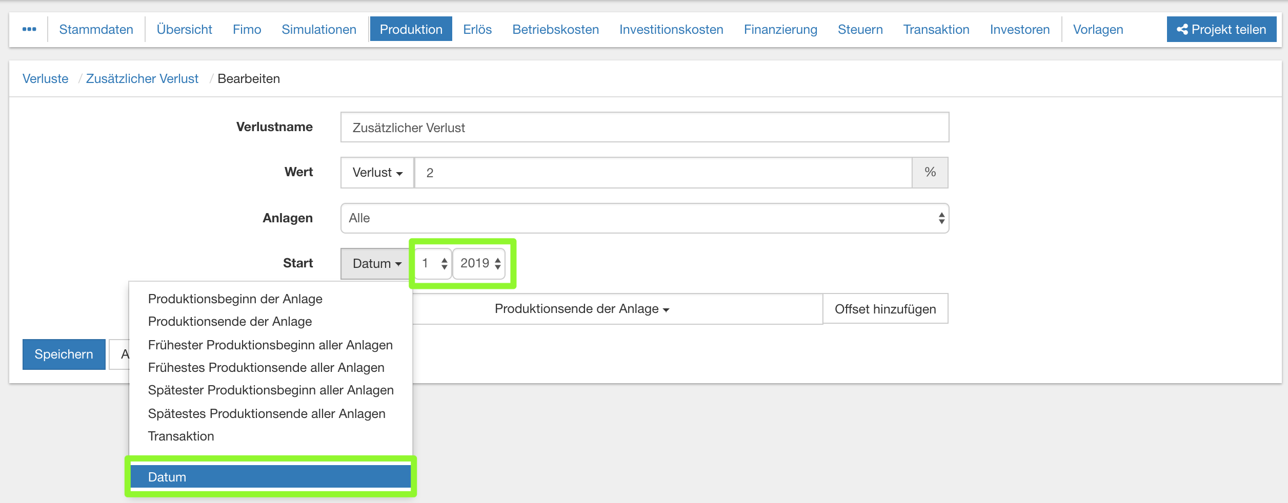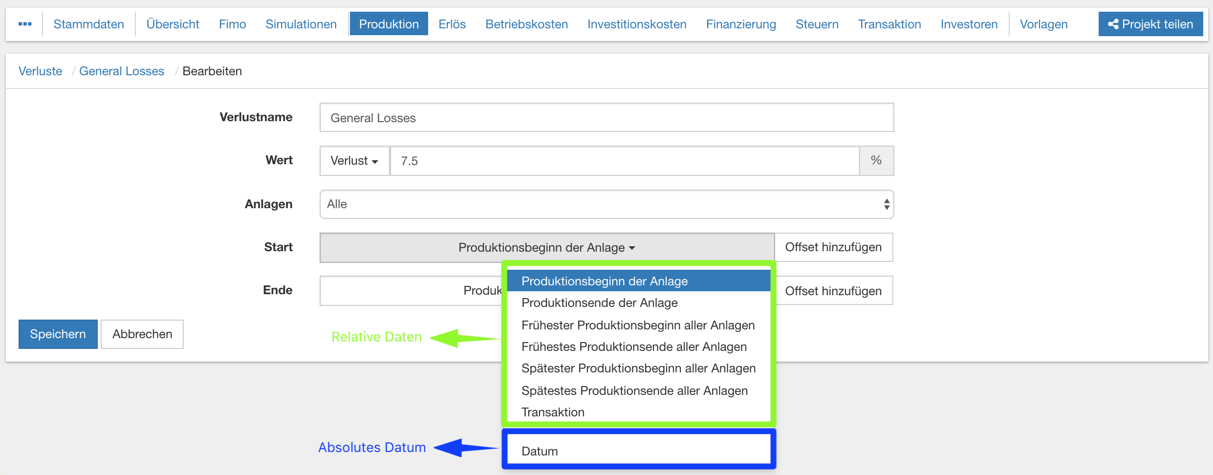 Benutzen Sie relative Daten wenn das Startdatum von einem anderen Datum abhängt. Beispiel: Sie treffen die Annahme, dass die Effizienz Ihrer Produktionsanlagen in den ersten 5 Jahren 98% und danach 97% beträgt. Das erste Verlustobjekt "Effizienz bis Jahr 5" startet somit bei Produktionsbeginn der Anlage und endet nach 5 Jahren. Das Enddatum können Sie modellieren, indem Sie das relative Datum "Produktionsbeginn der Anlage" wählen und als Offset 5 Jahre erfassen.