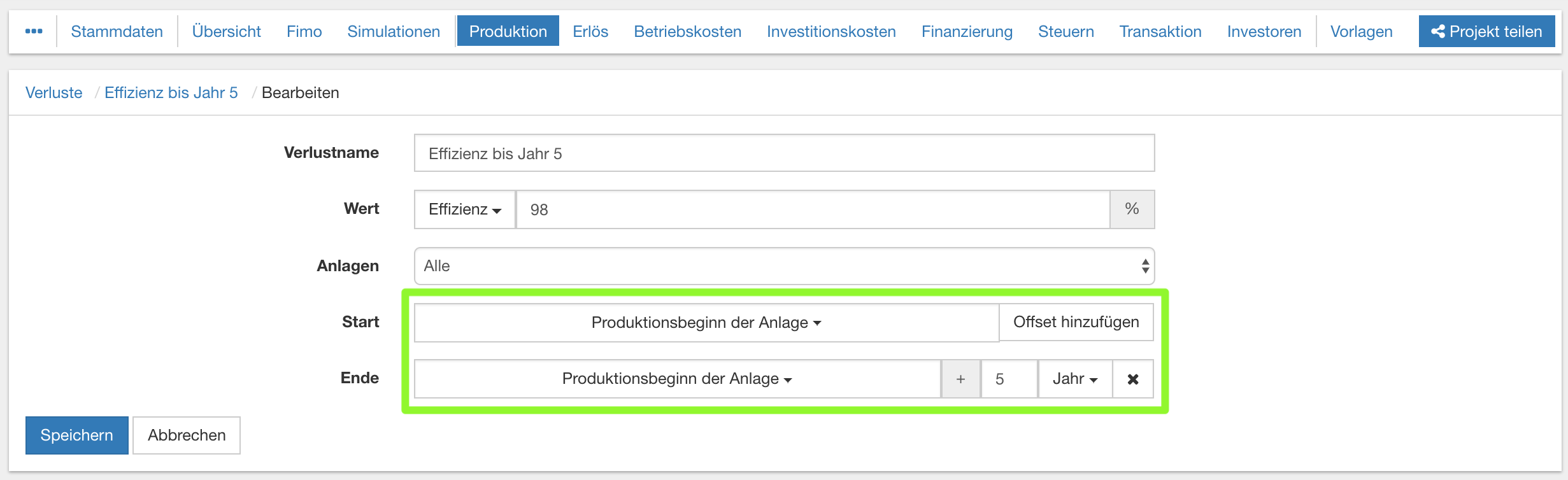 Das zweite Verlustobjekt "Effizienz nach Jahr 5" startet 5 Jahre nach "Production Unit Start" und endet am Ende der Laufzeit der Anlage ("Production Unit End").