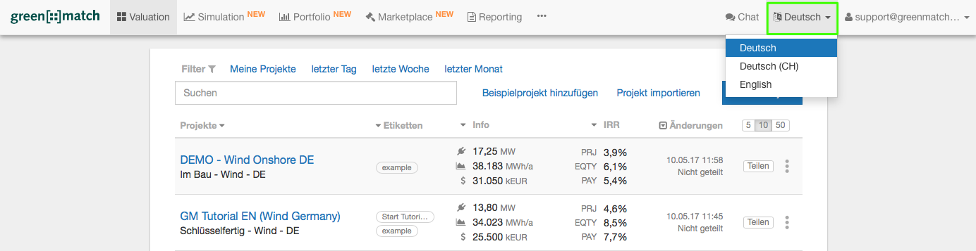 Sie können ganz einfach die Sprache wechseln, indem Sie oben rechts in der Top Navigation das Dropdown umschalten.