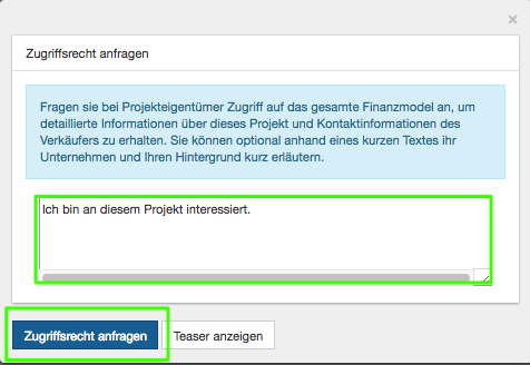 - Wünschen Sie weitere Informationen zum Projekt können Sie direkt beim Projektverkäufer die Zugriffsrechte anfordern. Klicken Sie dazu auf "Zugriffsrecht anfordern". Sie können optional anhand eines kurzen Textes Ihr Unternehmen und Ihren Hintergrund erläutern.
