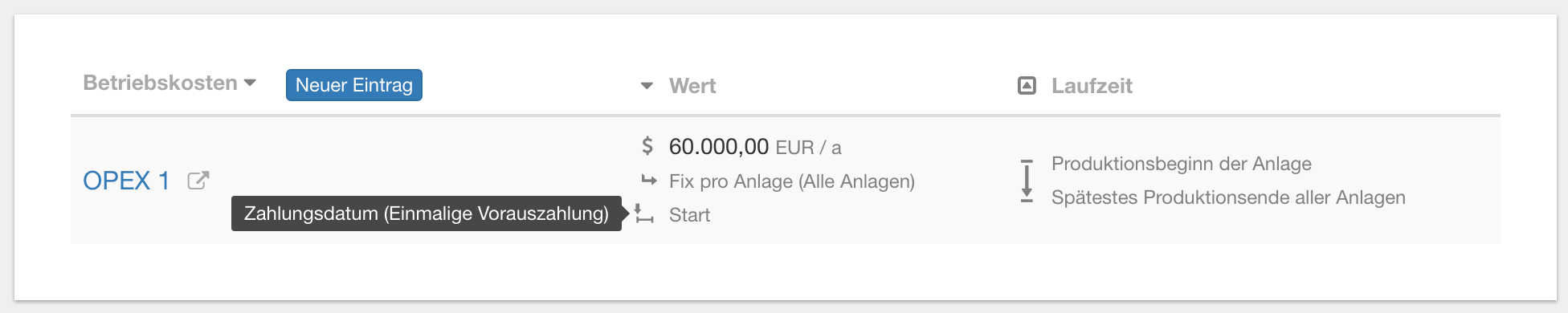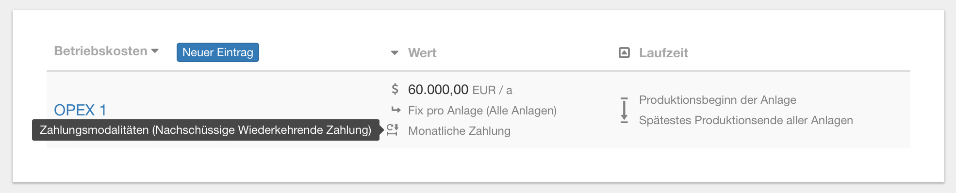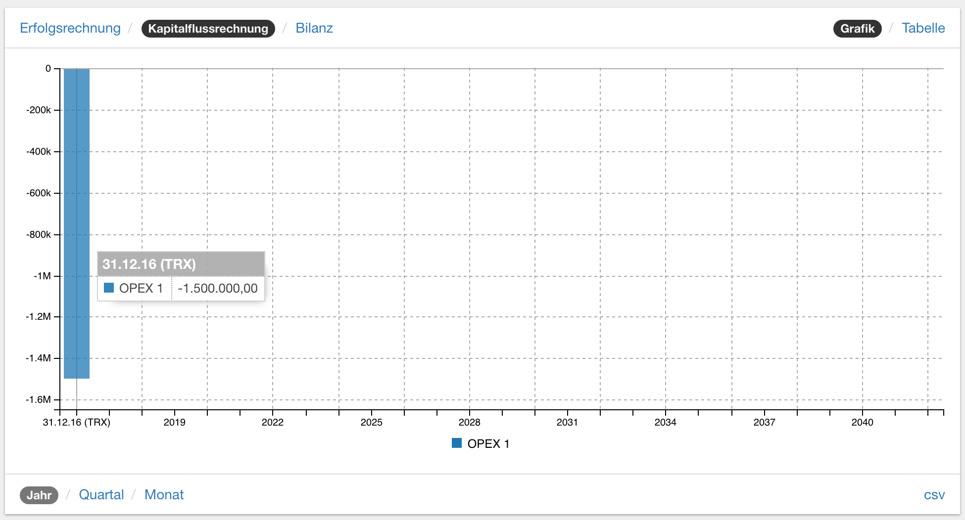 In diesem Artikel zeigen wir Ihnen die Unterschiede anhand einer Betriebskostenposition. Um den Unterschied zu illustrieren, haben wir ein einfaches Projekt erfasst, welches nur Erlöse und eine Betriebskostenposition enthält. Die Erlöse betragen 120'000 Euro pro Jahr und die Betriebskosten 60'000 Euro pro Jahr.