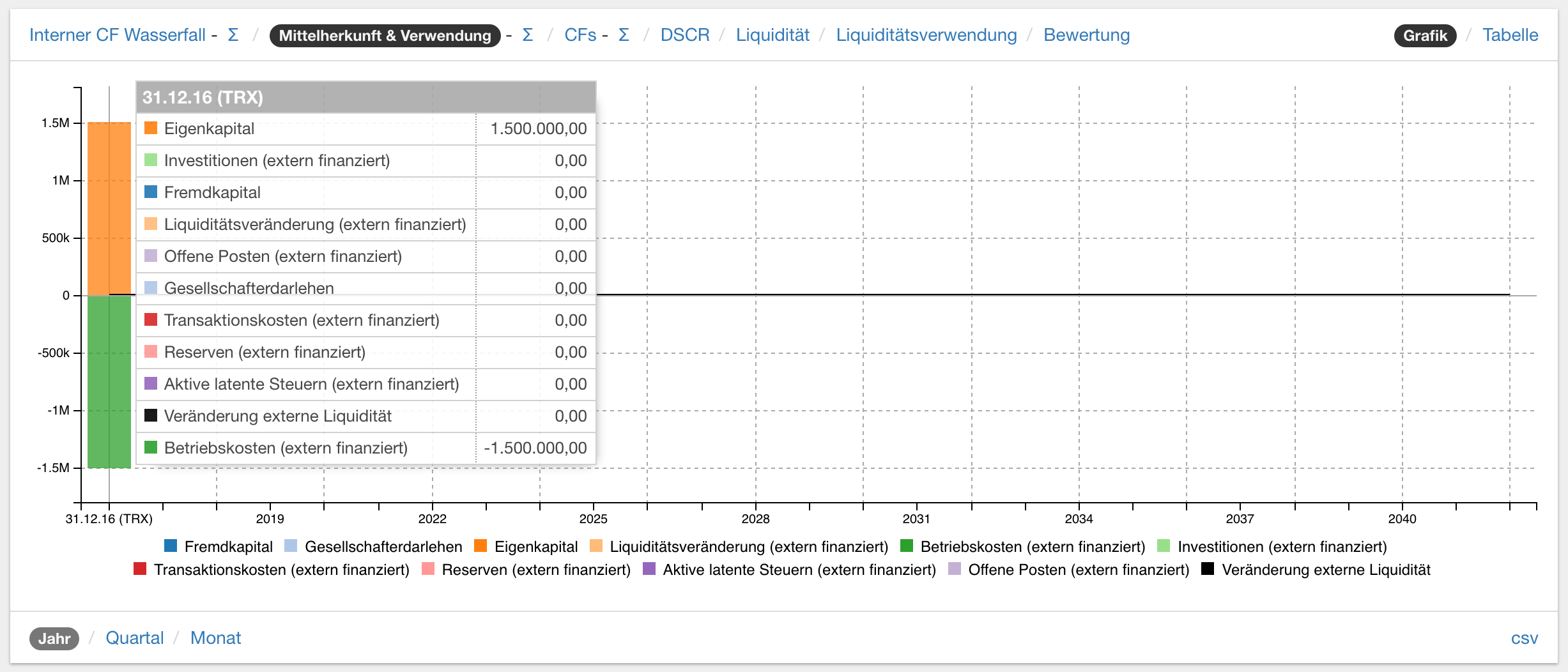b. Da die Betriebskosten in diesem Fall "Extern" finanziert werden, ergibt sich ein Eigenkapitalbedarf von 1'500'000 Euro bei Transaktion. Dieses Eigenkapital wird verwendet, um die Vorauszahlung der Betriebskostenposition zu decken. Dies wird in der Grafik "Mittelherkunft & Verwendung" im Bereich "Übersicht" ersichtlich. Diese Grafik zeigt alle externen Mittelflüsse.