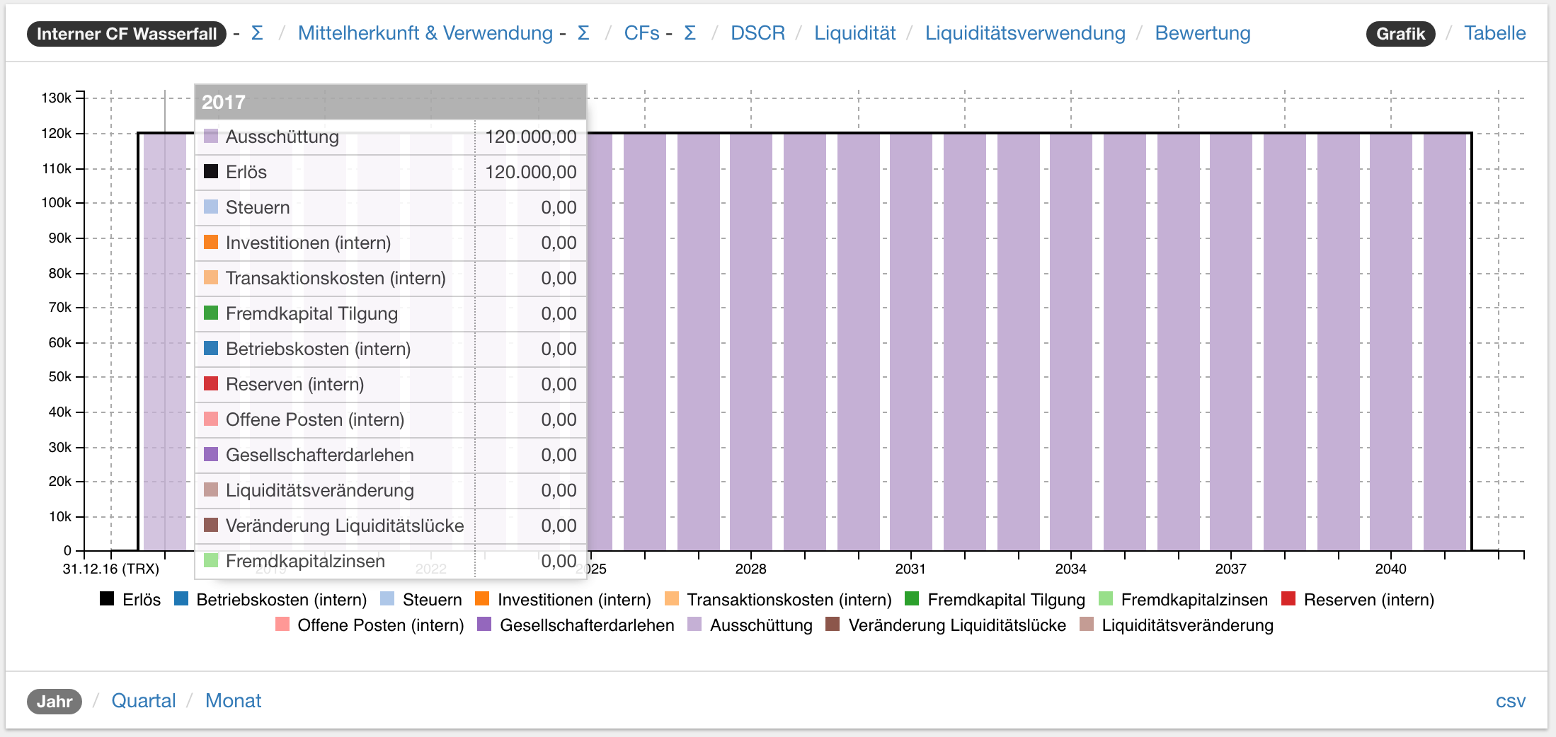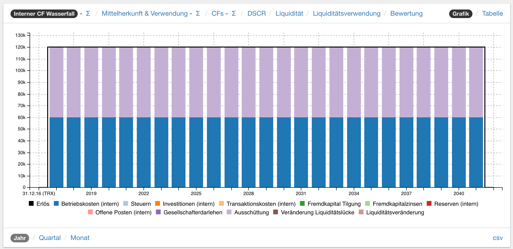 a. Im Bereich "Übersicht" in der Grafik "Interner CF Wasserfall" (diese Grafik zeigt alle internen Mittelflüsse) erscheinen die Erlöse als schwarze Linie und darunter die Ausgaben als Säulen. Von den 120'000 Euro Erlösen werden 60'000 Euro für die Betriebskosten benötigt, die restlichen 60'000 Euro können als Dividende ausgeschüttet werden. Die Erlöse reichen somit aus um die Betriebskosten zu decken.