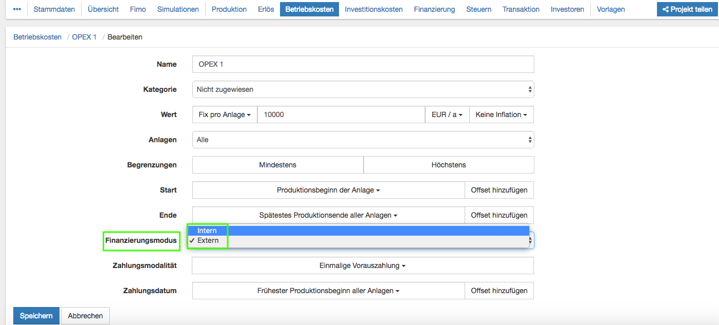Wenn Sie eine Betriebskostenposition bearbeiten, können Sie im Inputfeld "Finanzierungsmodus" zwischen "Intern" und "Extern" wählen.