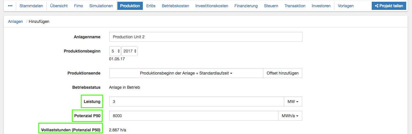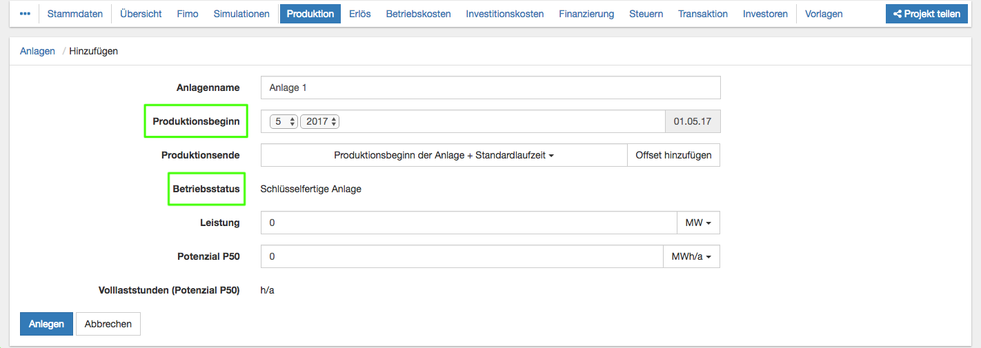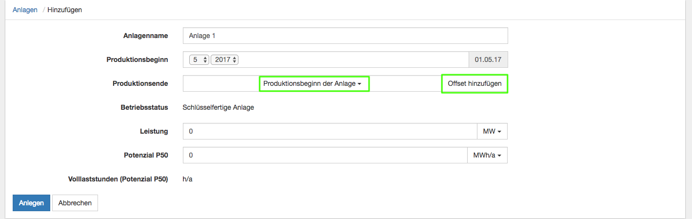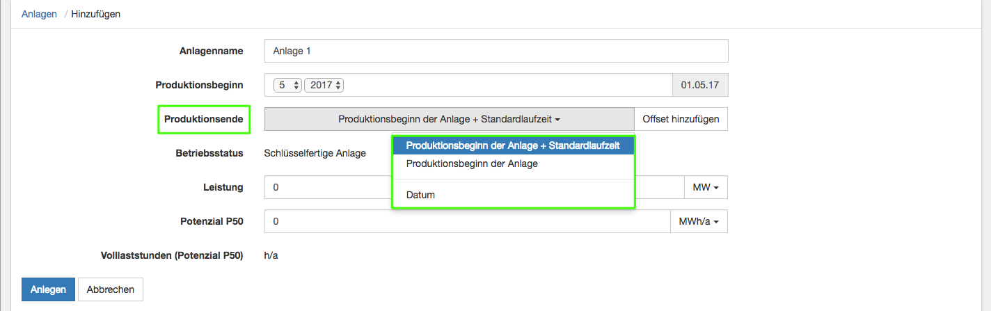 - Bei einer Laufzeit, die von der Standardlaufzeit abweicht, wählen Sie "Produktionsbeginn der Anlage" und "Offset hinzufügen". Dabei geben Sie als Offset die gewünschte Laufzeit (in Monaten oder Jahren möglich) ein.