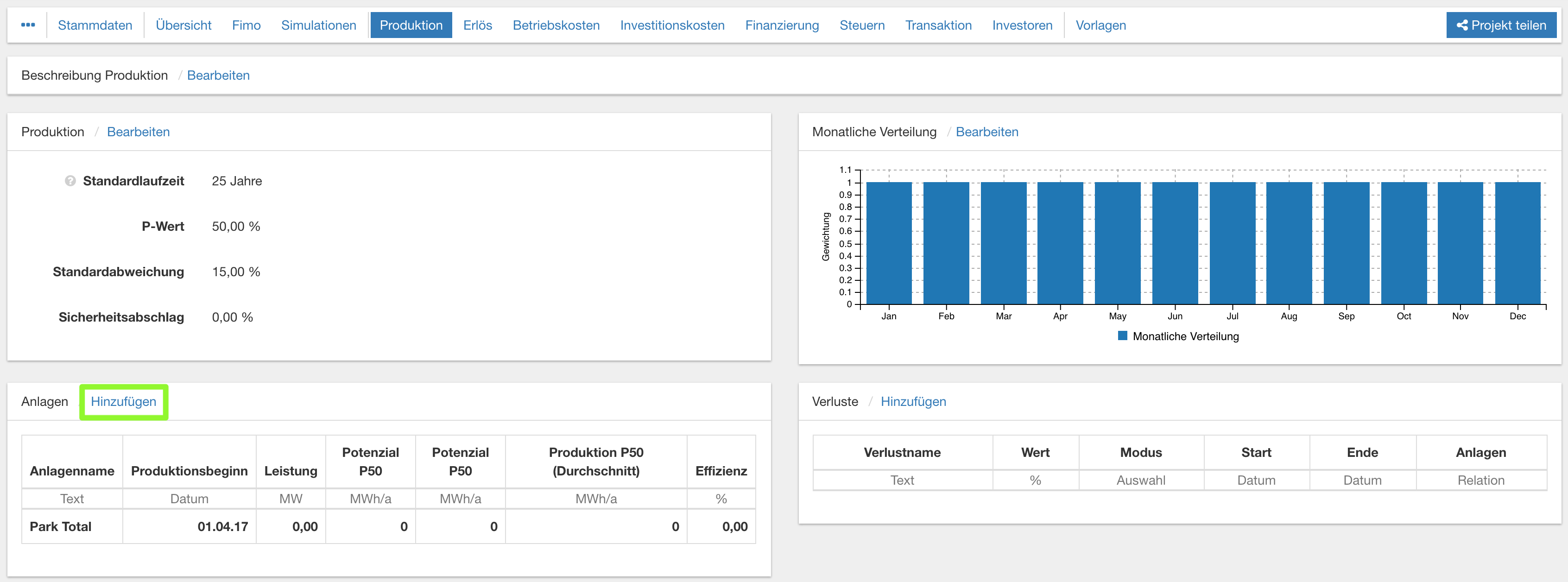 - Klicken Sie in der Projektnavigation auf den Bereich "Produktion". Um dem Projekt eine neue Produktionsanlage hinzuzufügen, klicken Sie im Abschnitt "Anlagen" auf "Hinzufügen".