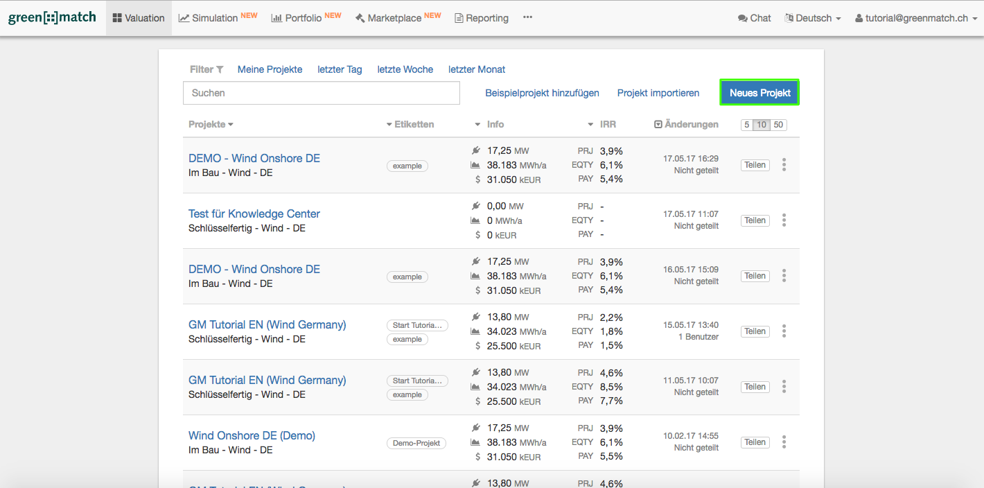 - In einem ersten Schritt klicken Sie dazu in der GM Valuation Projektliste oben rechts auf "Neues Projekt".
