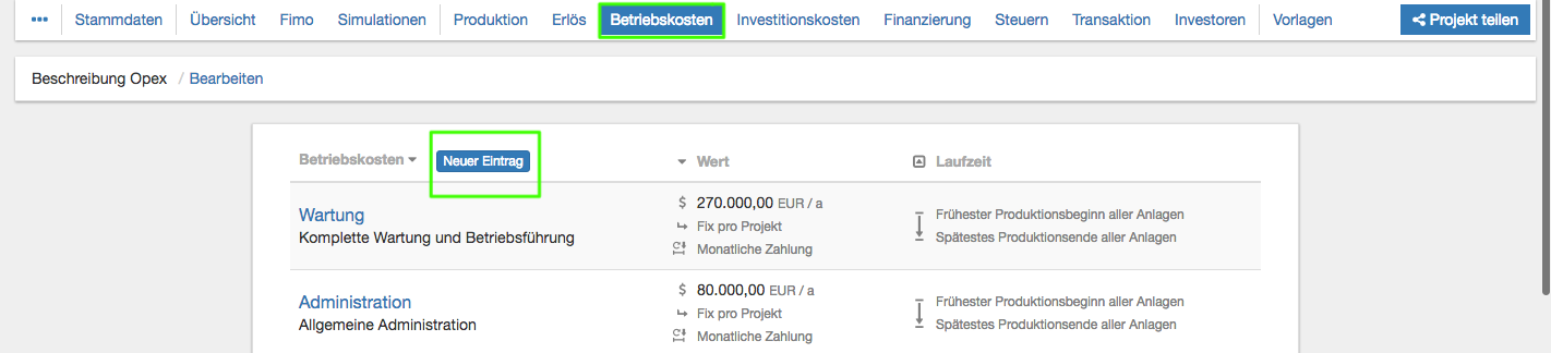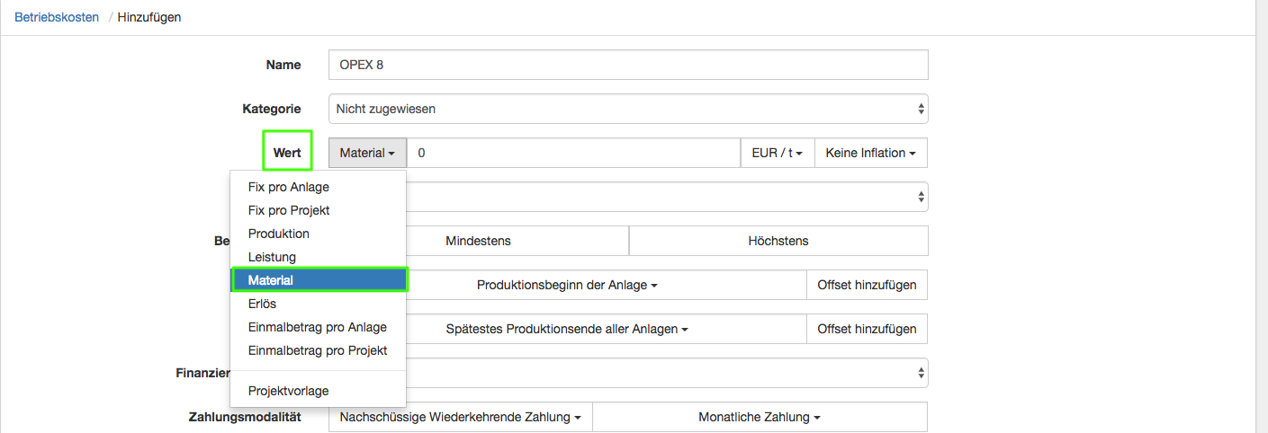 - Um die Einkaufskosten von Inputmaterial abzubilden, gehen Sie in den Bereich "Betriebskosten" und klicken auf "Neuer Eintrag". Beim Inputfeld "Wert" wählen Sie aus der Dropdown Liste den Eintrag "Material" und geben einen entsprechenden Preis ein. Bestätigen Sie die Eingabe mit einem Klick auf "Anlegen".