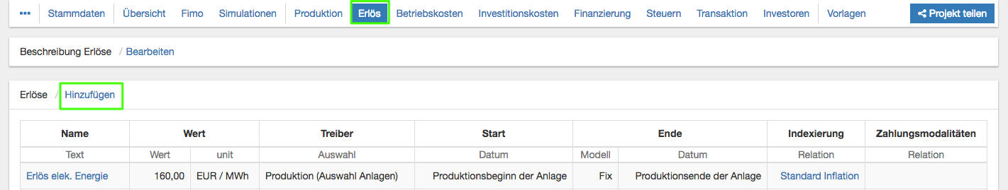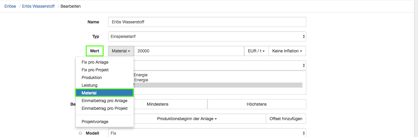 - Um Material zu verkaufen, gehen Sie in den Bereich "Erlös" und klicken auf "Hinzufügen". Beim Inputfeld "Wert" wählen Sie aus der Dropdown Liste den Eintrag "Material" und geben einen entsprechenden Preis ein. Bestätigen Sie die Eingabe mit einem Klick auf "Anlegen".