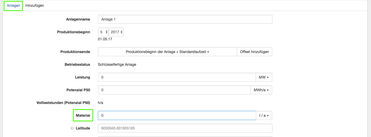Tipp: Möchten Sie einer Anlage mehr als einen Materialtypen zuweisen, können Sie dies in mehreren Anlagen erfassen (z.B. das Inputmaterial anhand einer Anlage für elektrische Energie und das Outputmaterial anhand einer Anlage für thermische Energie).