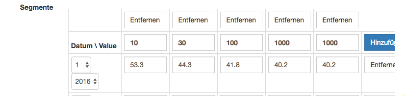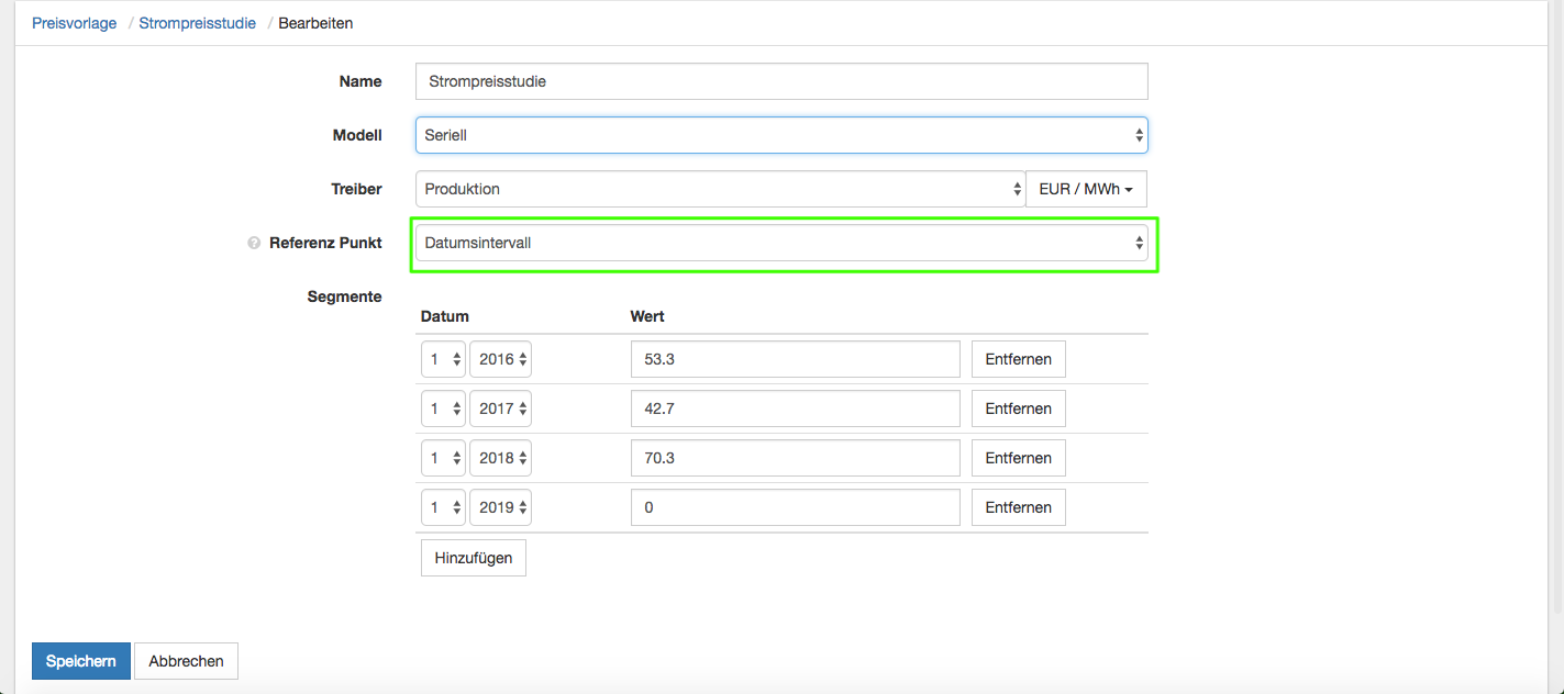 • Referenzpunkt "Datumsintervall": Dieser Input bedeutet, dass der Tarif über die Zeit variabel ist. Das heisst in unserem Beispiel, dass für das Jahr 2016 die in der ersten Zeile definierten Tarife gelten und fürs Jahr 2017 die aus der zweiten Zeile, usw.