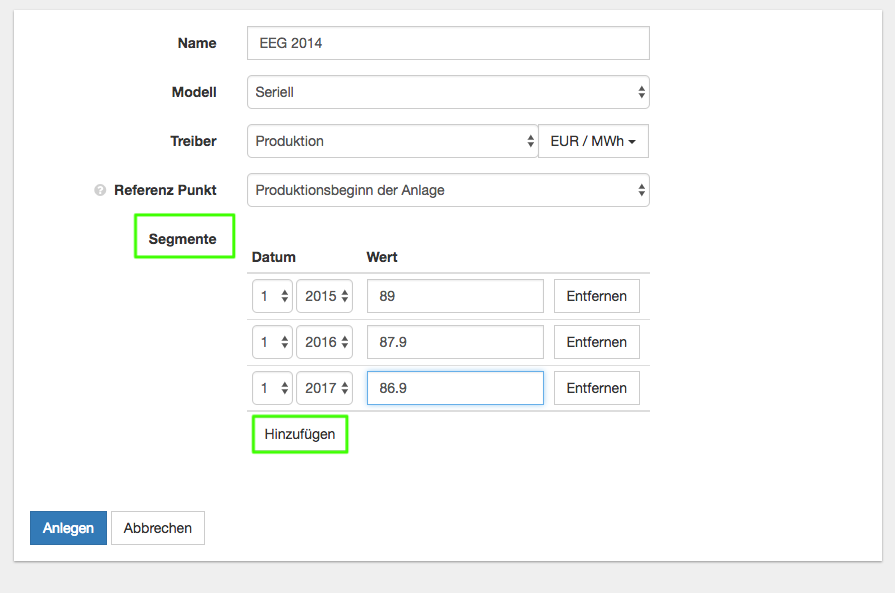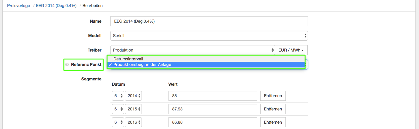 • Referenzpunkt "Produktionsbeginn der Anlage": Dieser Input bedeutet, dass der Tarif abhängig vom Inbetriebnahmedatum der Anlage ist (wird in den Zeilen definiert).