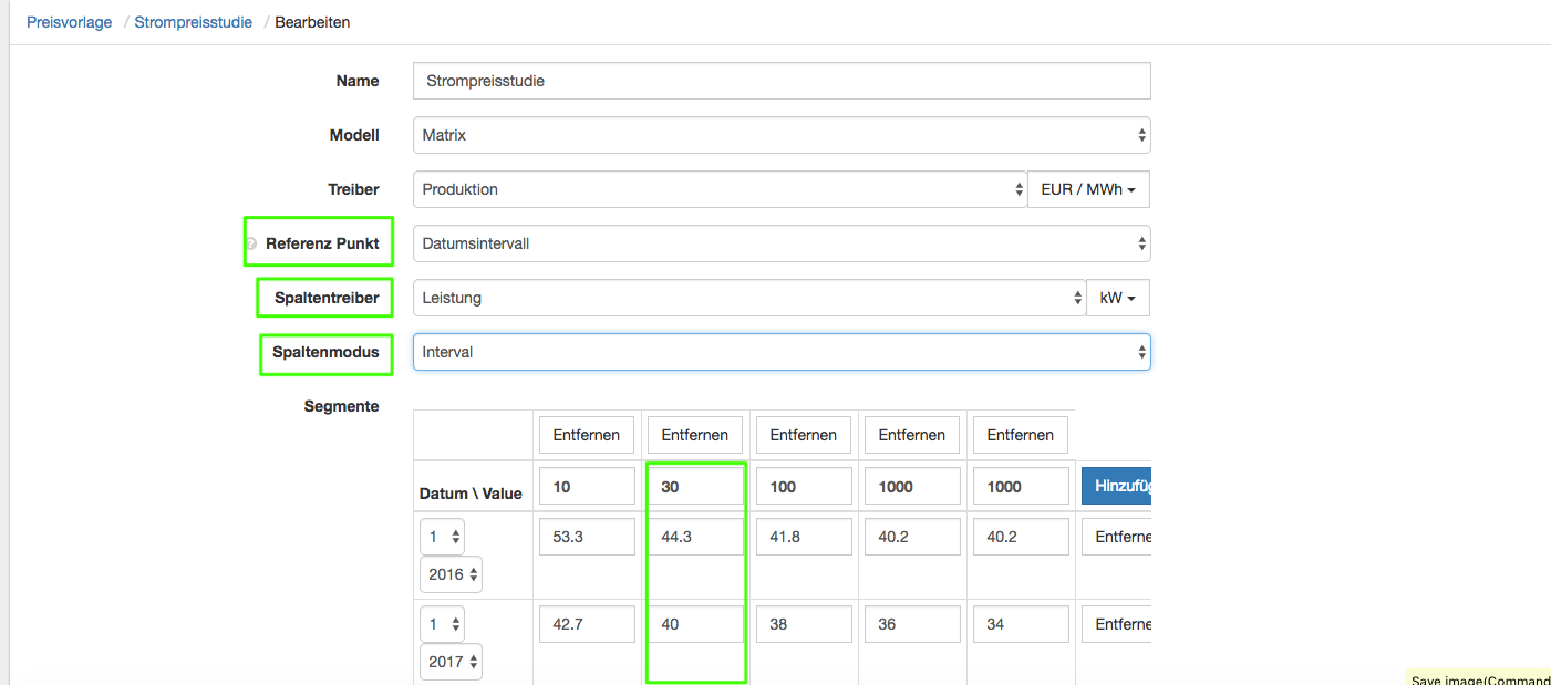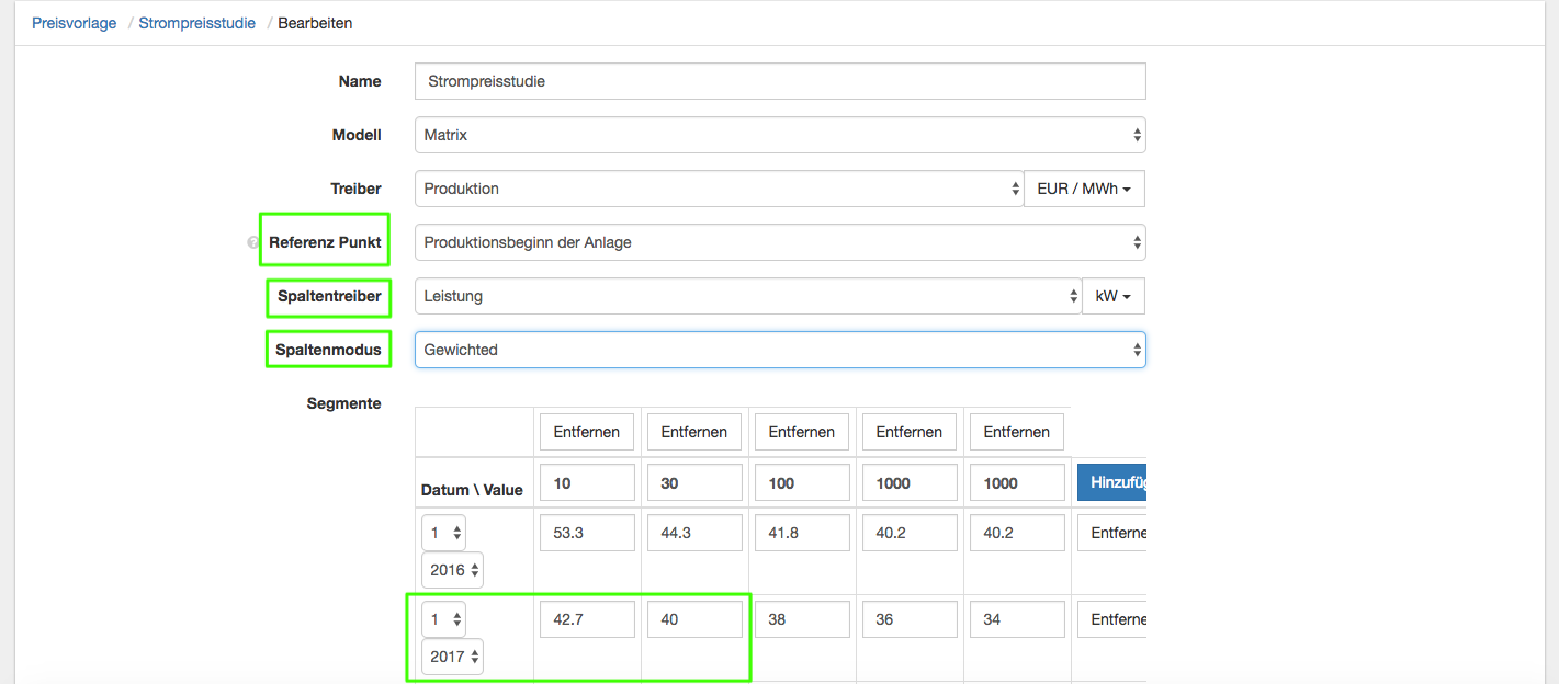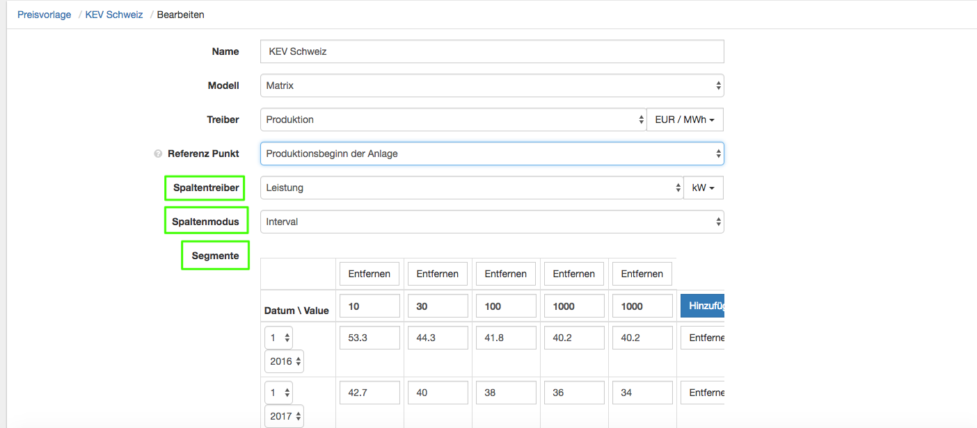 1. Wenn Sie als Modell "Matrix" wählen, können Sie einen Tarif dessen Höhe von der Inbetriebnahme der Anlage und der installierten Leistung oder der Produktion der Anlage abhängt erfassen.