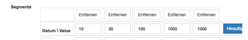 * Beispiel: Wählen Sie "Leistung" als Spaltentreiber ist die Vergütung von der Leistung der Anlage abhängig. In unserem Beispiel bedeutet dies, dass Anlagen abhängig von Ihrer Leistung eine andere Vergütung erhalten: ≤ 10 kW, 10-30 kW, 30-100 kW, 100 - 1'000 kW und > 1'000 kW. Beispiele für diese Anwendungsform: EEG Deutschland 2014, KEV Schweiz.