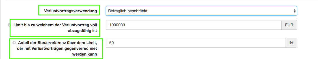 - Verlustvorträge welche den Betrag von 1.000.000 EUR überschreiten können bei der deutschen Gewerbesteuer zu 60% angerechnet werden. Entsprechend wählen Sie beim Inputfeld "Verlustvortragsverwendung" den Eintrag "Betraglich beschränkt" aus. Nun können Sie unter "Limit bis zu welchem der Verlustvortrag voll abzugsfähig ist" 1.000.000 eingeben und beim "Anteil der Steuerreferenz über dem Limit, der mit Verlustvorträgen gegenverrechnet werden kann" 60%.