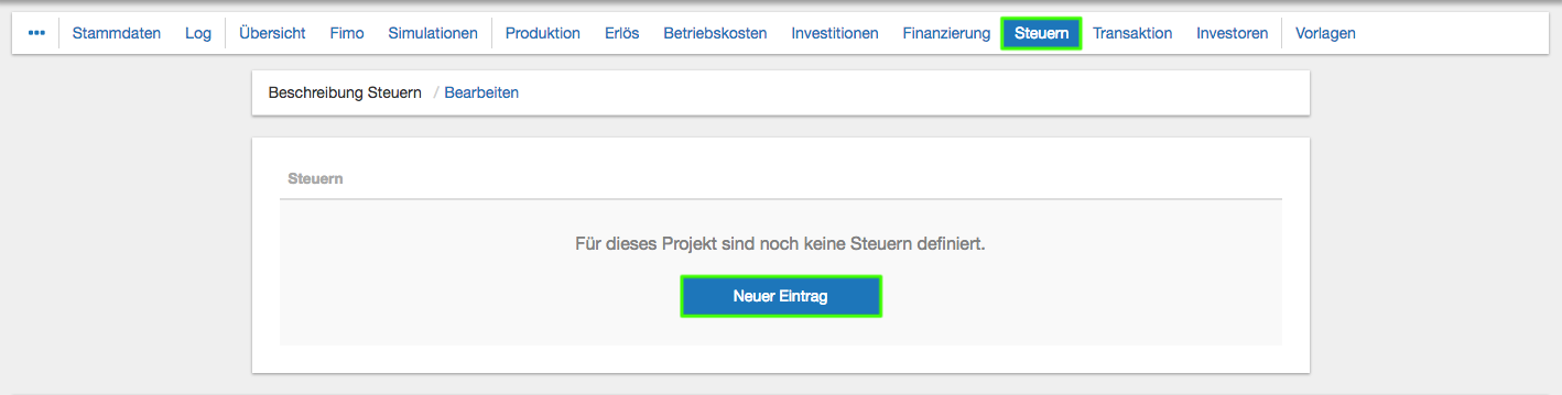 - Öffnen oder erstellen Sie ein GM Valuation Projekt und begeben Sie sich in den Bereich "Steuern". Dort können Sie durch einen Klick auf "Hinzufügen" ein neues Steuerobjekt anlegen.