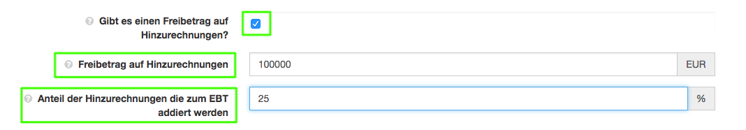- Nun haben Sie die Möglichkeit, einen Freibetrag auf Hinzurechnungen und den Anteil der Hinzurechnungen die zum EBT addiert werden einzugeben. Die Hinzurechnung erfolgt nur, soweit die Summe aller Hinzurechnungsbeträge den Betrag von 100.000 Euro übersteigt (Freibetrag). Diese Hinzurechnungen werden zu 25% zur Steuerreferenz hinzugerechnet. Folgendermassen müssen Sie beim Inputfeld