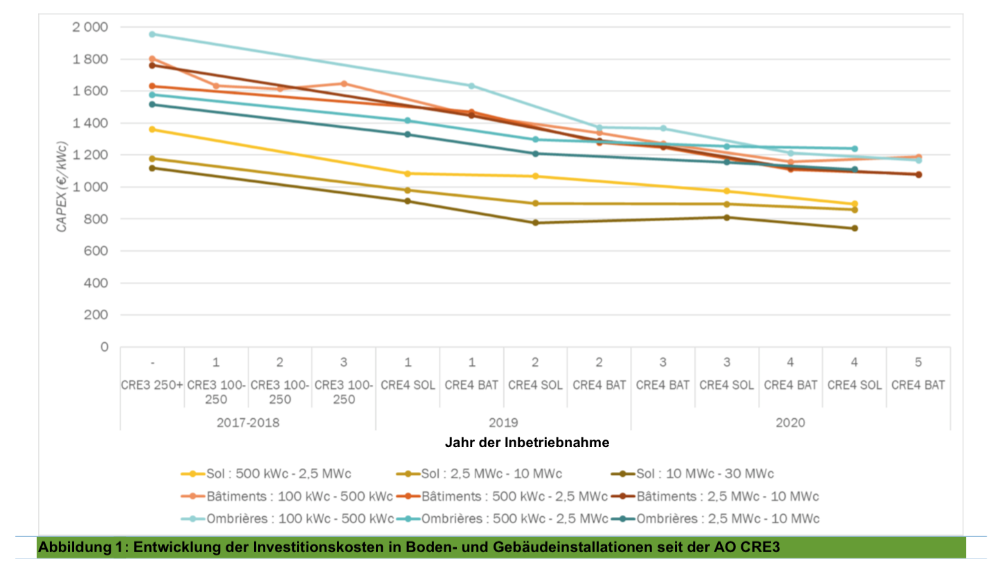 Am 7. März 2019 hat die unabhängige französische Energiebehörde CRE (Commission de Régulation de l‘Énergie) einen vielversprechenden Bericht veröffentlicht, der auf eine positive Kostenentwicklung für mittlere bis großflächige PV-Anlagen in Frankreich hinweist.