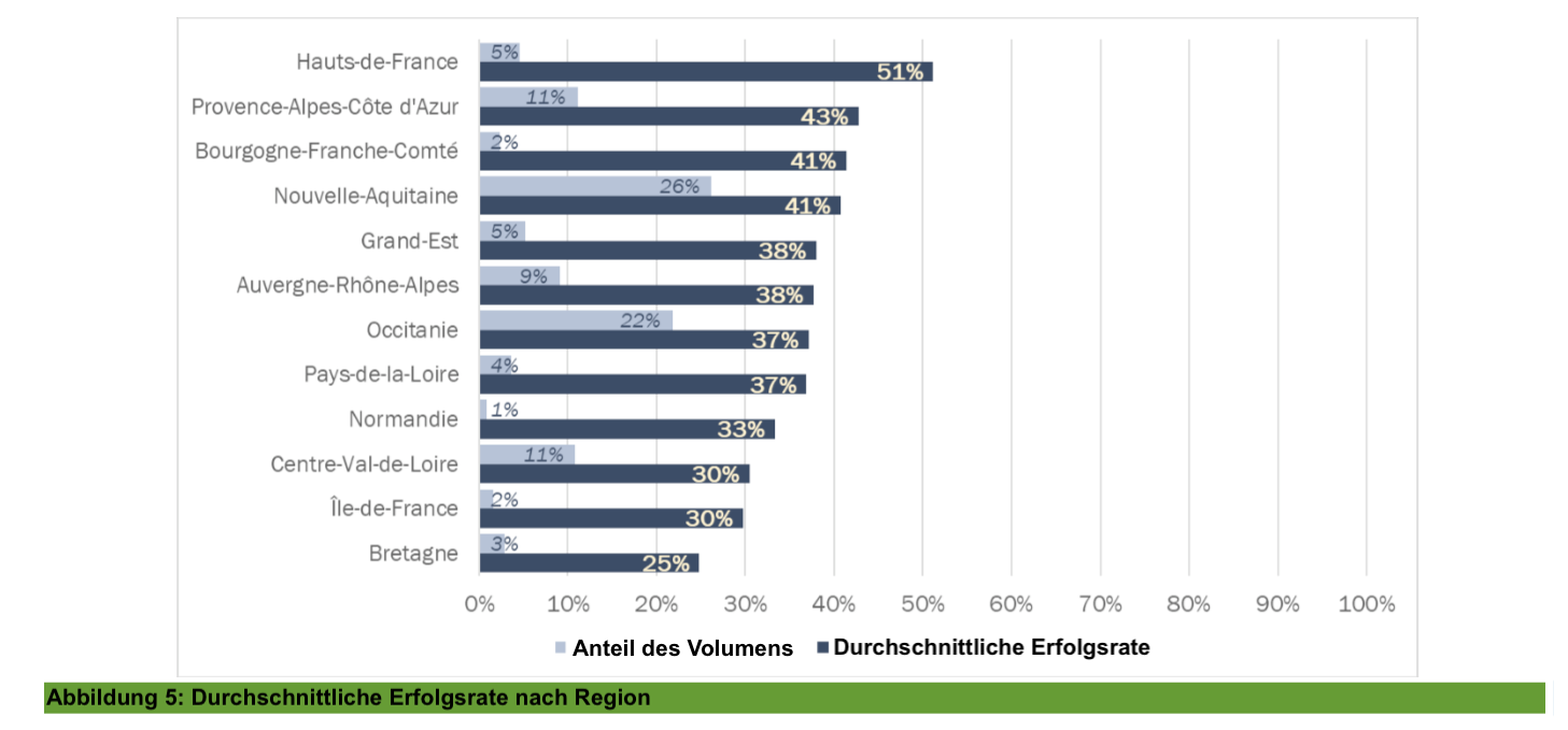 Der Bericht der französischen Energiebehörde zeigt außerdem, dass keine maßgeblichen regionalen Unterschiede im Hinblick auf die Wirtschaftlichkeit bestehen. Während die südlichen Regionen wetterbedingt mit höheren Produktionsleistungen rechnen können, profitieren Erzeuger im Norden von Zuschüssen für Anlagen in Gewerbegebieten. So ergibt sich eine ausgeglichene Erfolgsquote für Projekte im Norden und Süden (siehe Abbildung 5).