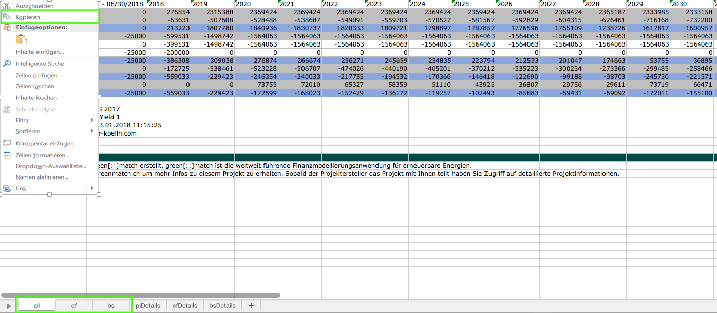 - Kopieren Sie in einem nächsten Schritt die Arbeitsblätter der Übersichten (pl, cf, bs) aus dem Fimo-Excel-Export.