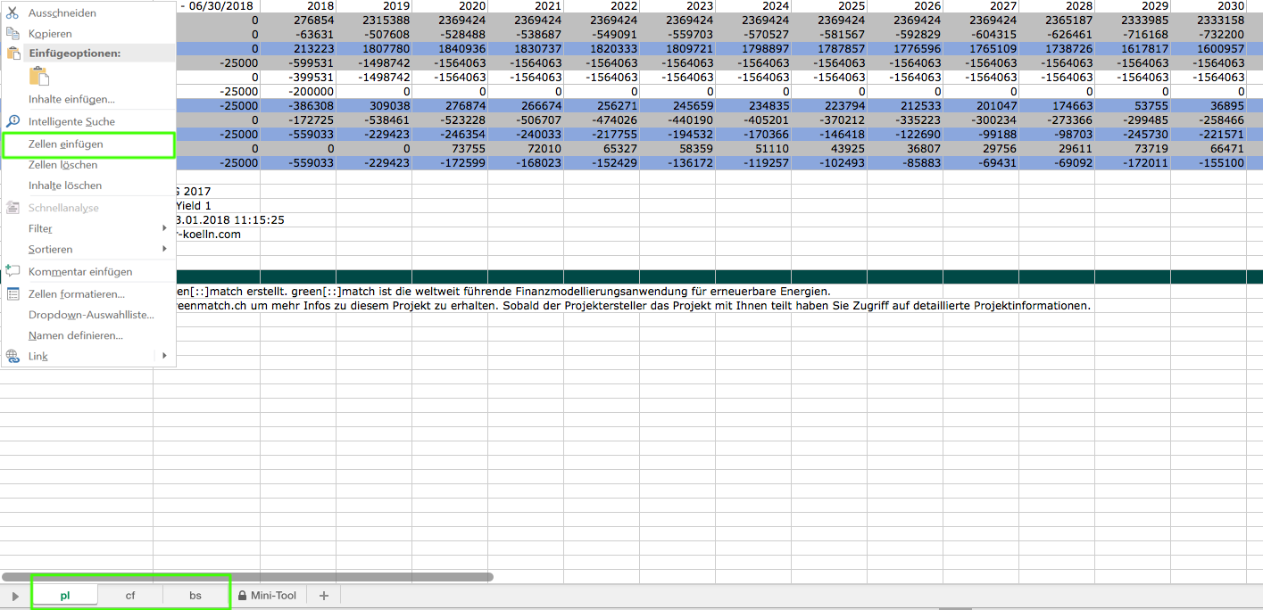 - Fügen Sie die Excel-Blätter pl, cf und bs in das Excel-Mini-Tool ein.