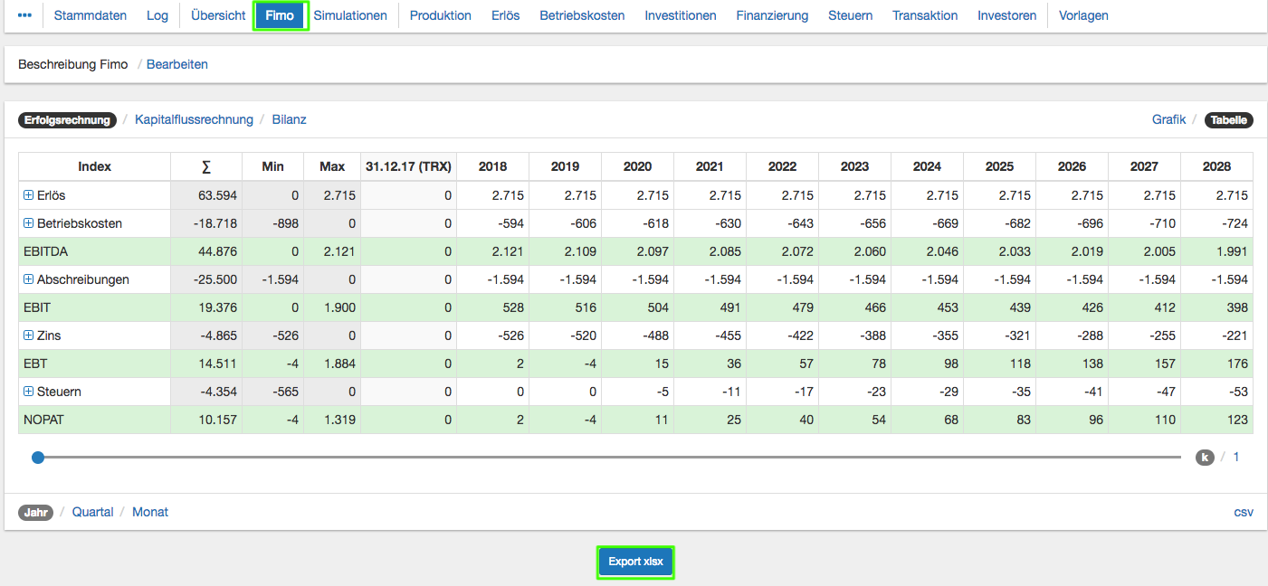 - Gehen Sie in einem ersten Schritt auf das gewünschte GM Valuation Projekt und klicken Sie im Bereich "Fimo" auf "Export xlsx". Das Dokument wird direkt auf ihren Computer geladen. Sie finden das Dokument unter Ihren Downloads.