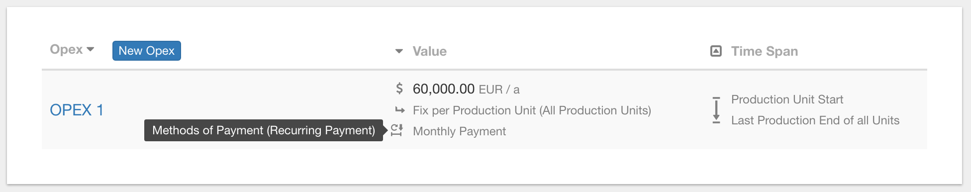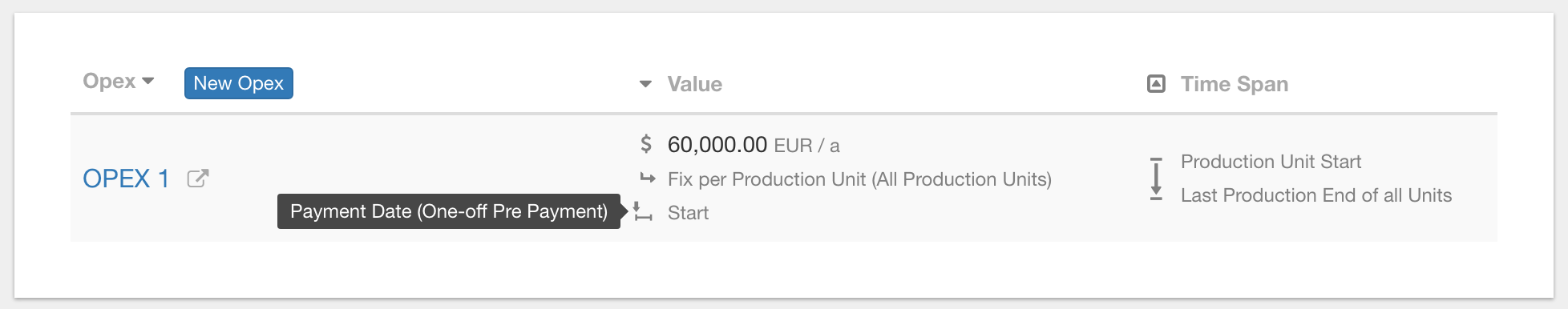 - External: To be covered by debt, equity or shareholder loans (standard for Capex items and transaction expenditures) --> This option should be selected if the revenues are insufficient to cover the expenses. In this article we will show you the difference based on a Opex item. To illustrate the difference, we have created a simple project that contains only sales and one Opex item. The sales are 120'000 EUR per year and the Opex 60'000 EUR per year.
