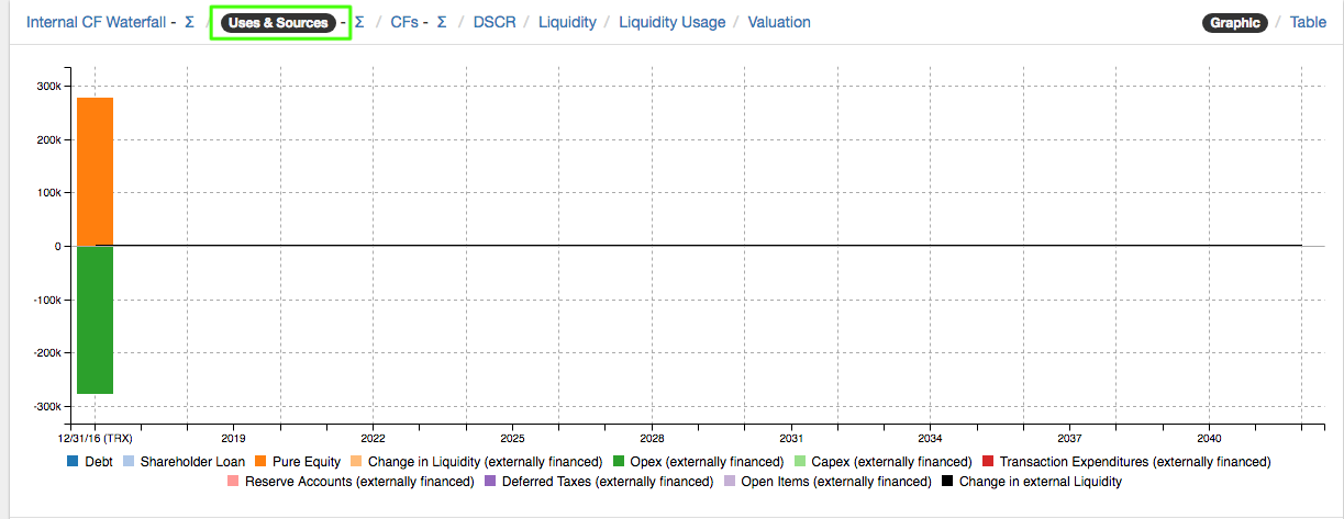 b. Since the Opex are financed "external", there is an equity requirement of € 1,500,000 at transaction. This equity is used to cover the one-off payment of the Opex item. This can be seen in the "Overview" section at the graph "Uses & Sources". This graph shows all external cash flows.