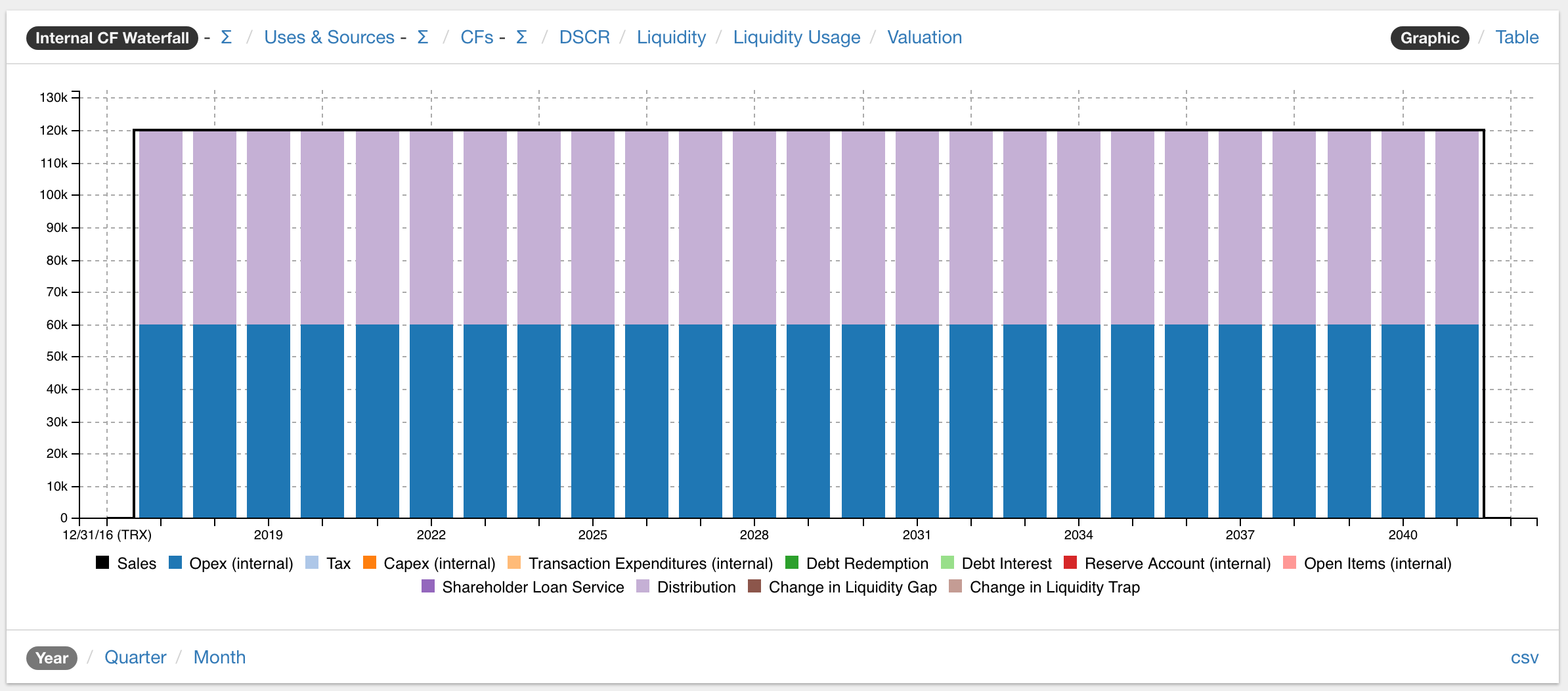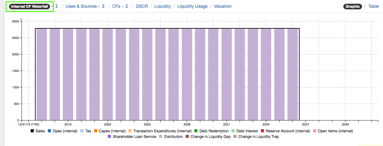 a. In the graph "Internal CF Waterfall" of the "Overview" section (this graph shows all internal cash flows), the sales are represented by the black line and the expenses as bars directly below the sales. 60.000 EUR of the 120.000 EUR sales are needed for the Opex payment. The remaining 60'000 EUR can be distributed as a dividend. Thus the sales are sufficient to cover the Opex.