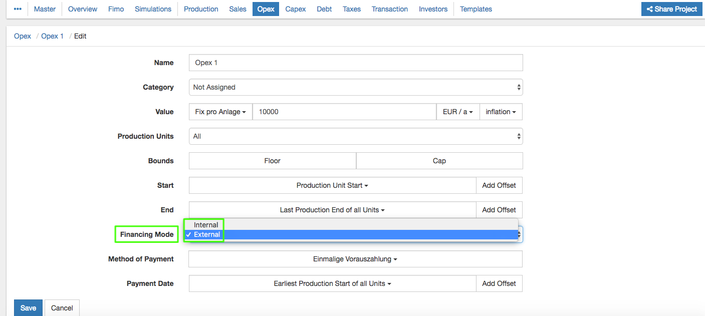If you are editing an Opex item, you can choose between "internal" or "external" in the input field "Financing Mode".