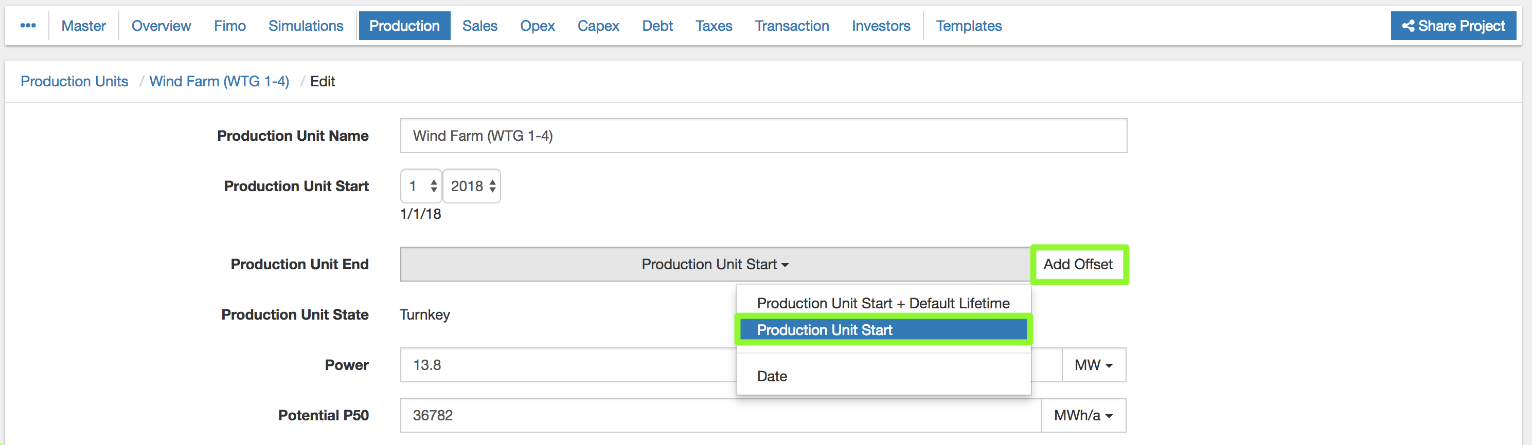 • If there is a lifetime that deviates from the default lifetime you can choose "Production Unit Start" and "Add Offset". There you enter the desired lifetime in months or years.