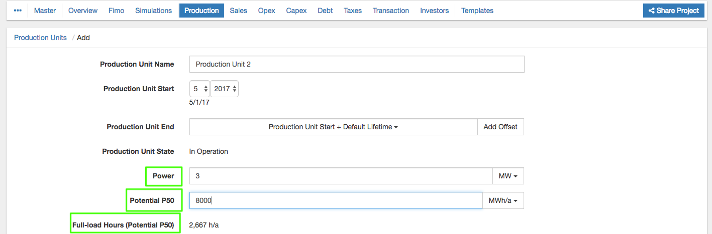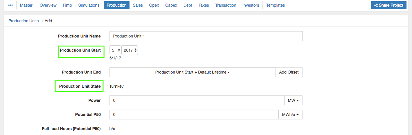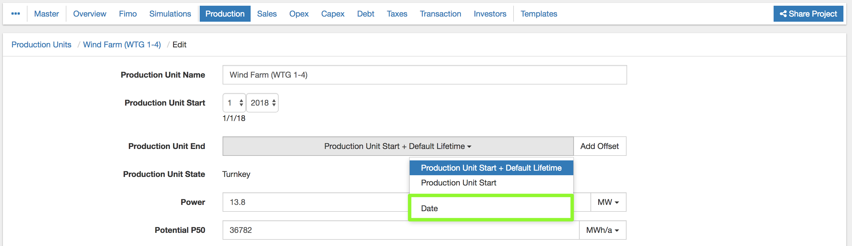 • By default, the Production Unit End is the Production Unit Start plus the defined default lifetime. (The default lifetime can be changed in the "Production" section and varied in the "Simulation" section in order to simulate different scenarios).