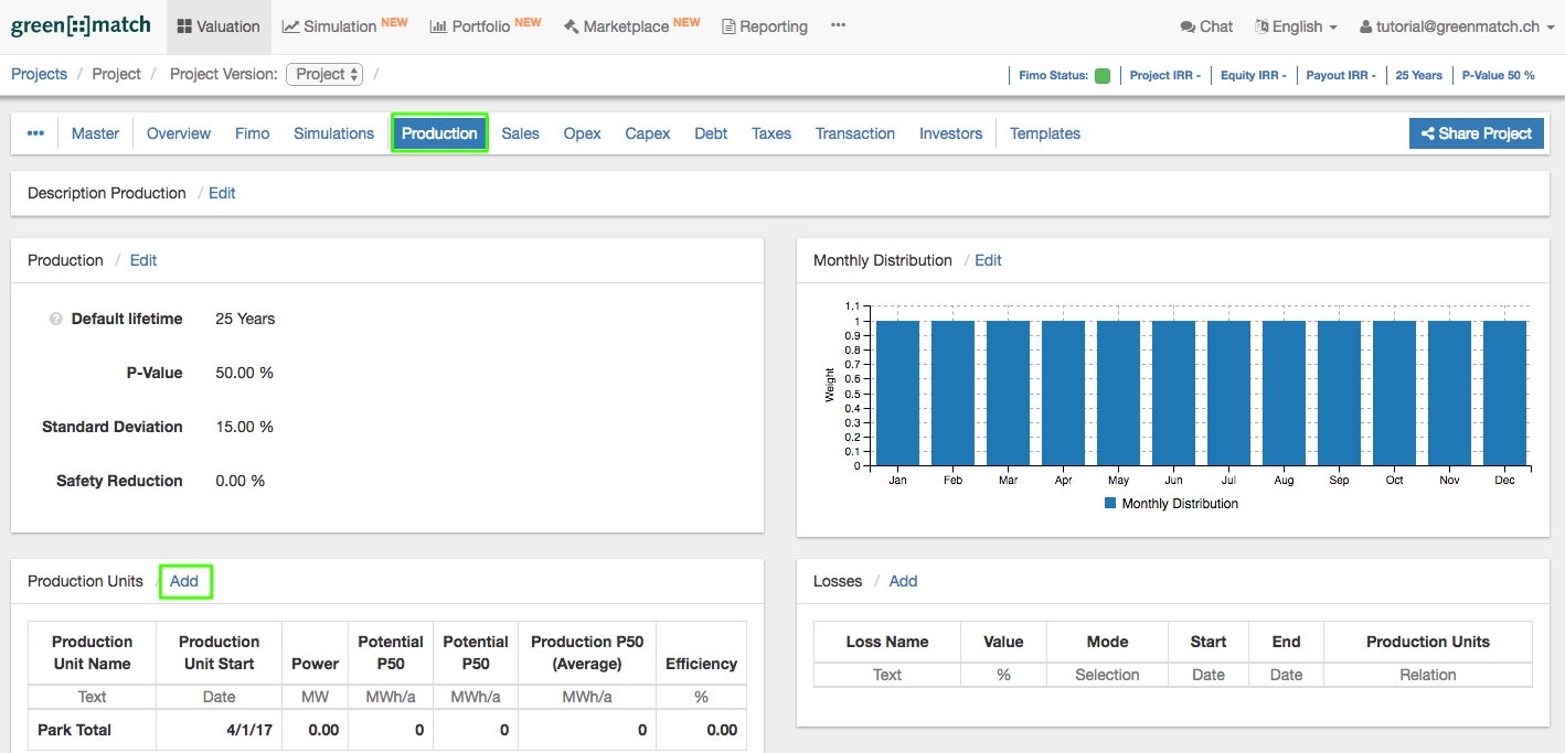 1. Click on "Production" in the Project Navigation. To add a new Production Unit to the project, click on "Add" in the section "Production Units".