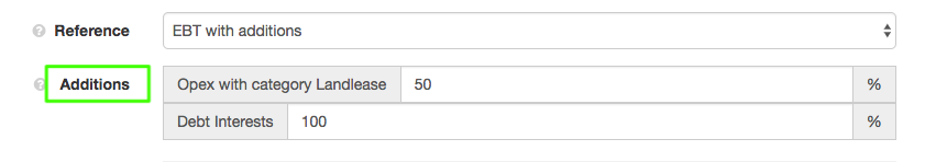 - For the German trade tax, 50% of the operating costs of the land lease category and 100% of debt interests are added to the tax reference. Please enter the following inputs in the "Additions" input fields: