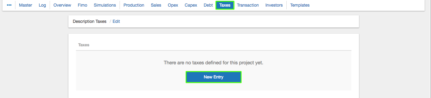 - Open or create a GM Valuation project and go to the "Taxes" section. There you can create a new tax object by clicking on "Add".