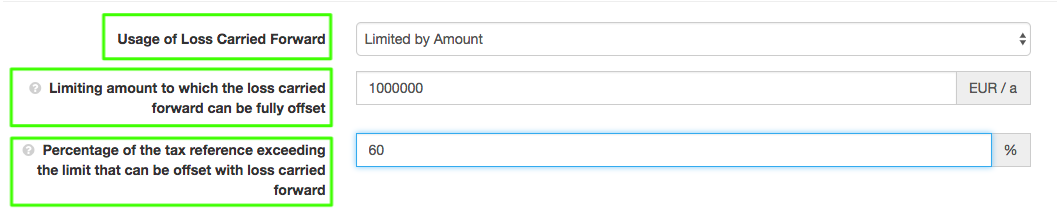 - If the EBT of the actual period is exceeding EUR 1.000.000, then only 60% of the exceeding amount can be offset with loss carried forward. Accordingly, select the entry "Limited by Amount" in the input field "Usage of Loss Carried Forward". Now you can enter 1,000,000 in the input field "Limiting amount to which the loss carried forward can be fully offset" and 60% for "Percentage of the tax reference exceeding the limit that can be offset with loss carried forward".