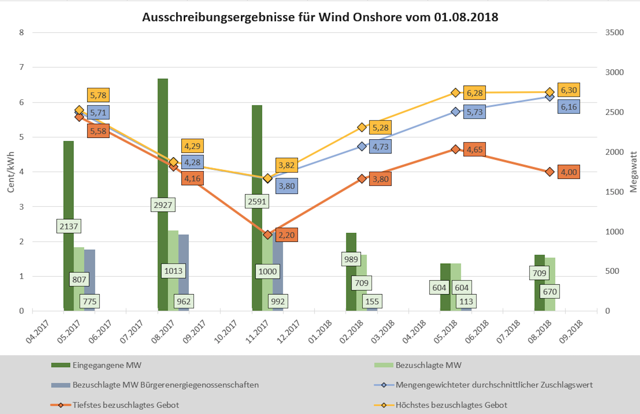 1. August 2018 veröffentlicht. Der mengengewichtete Zuschlagswerte ist das dritte Mal in Folge gestiegen. Während bei der Ausschreibung im November 2017 der Durchschnittswert noch 3,80 ct/kWh betrug, war dieser in der aktuellen Runde bei 6,16 ct/kWh. Der höchste bezuschlagte Tarif liegt mit 6,30 ct/kWh beim durch die Bundesnetzagentur festgelegten Höchstwert für diese Ausschreibungsrunde. Dies bedeutet, dass alle zur Ausschreibung zugelassenen Gebote bezuschlagt wurden (fünf Gebote mit insgesamt 42 MW wurden ausgeschlossen).