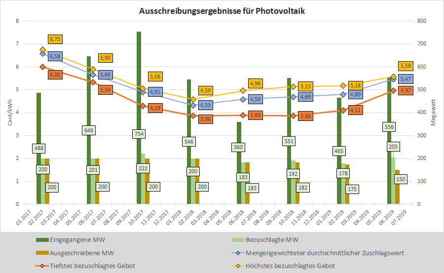 Für die Ausschreibung Solaranlagen vom 01. Juni 2019 wurden 105 Gebote im Umfang von 556 MW eingereicht. Folglich war die ausgeschriebene Menge von 150 MW deutlich überzeichnet. Insgesamt wurden 14 Gebote berücksichtigt mit einer zu errichtenden Solarleistung von 204,697 MW. Die deutlich über dem ausgeschrieben Volumen liegende Zuschlagsmenge resultiert laut Bundesnetzagentur aus einem "sehr grossen Gebot für eine Anlage, das die Zuschlagsgrenze bildete".