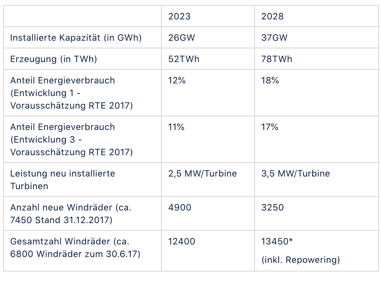 Ende 2017 umfasste die installierte Leistung an Windkraft in Frankreich 13,7 GW. Angesichts der für 2018 (14,3 GW) und 2023 (21,8 bis 23,3 GW) gesteckten Ziele sind die Anforderungen der Branche besonders hoch.