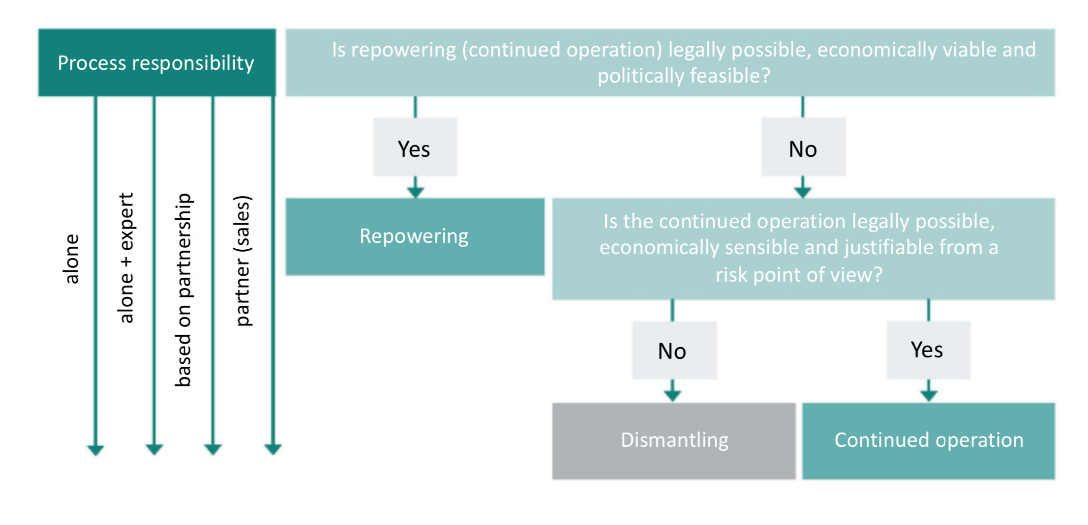 The graph illustrates possible ways of action and decision-making regarding wind turbines that have reached a lifetime of 20 years or more. It is a complex process that does not only require early-on planing, but just as well might profit from professional, external support.
