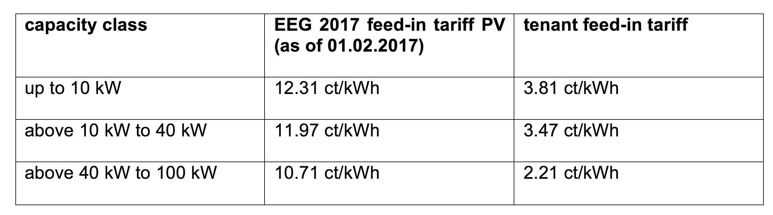 The Tenant Energy Act introduces a so-called “tenant energy surcharge”, which is an additional revenue component for tenant energy, besides market premium and feed-in tariff. The tenant as asset operator receives the tenant energy surcharge for electrical power generated in PV units (applicable to units up to in total 100 kW) which are either on top of or beside his residential building, given that the electrical energy is indeed consumed by an end user within this building. A building is considered a residential building if at least 40% of the building are used for housing purposes (sec. 21 para. 3 EEG 2017 new version).
