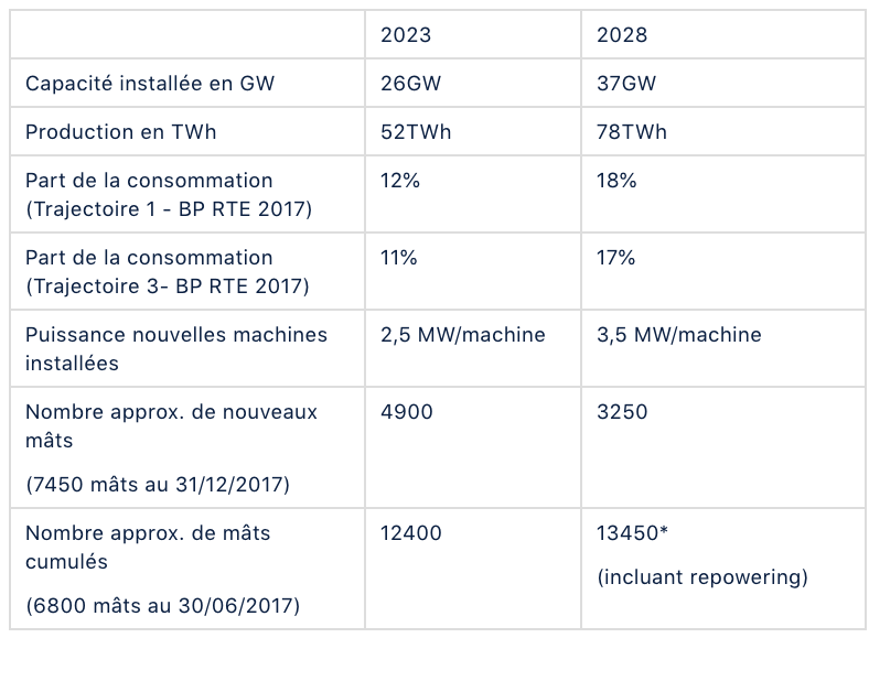 Fin 2017, le parc éolien français comprenait 13,7 GW. Compte tenu des objectifs fixés pour 2018 (14.300 MW) et 2023 (21.800 à 23.300 MW), le défi est particulièrement élevé pour cette filière.